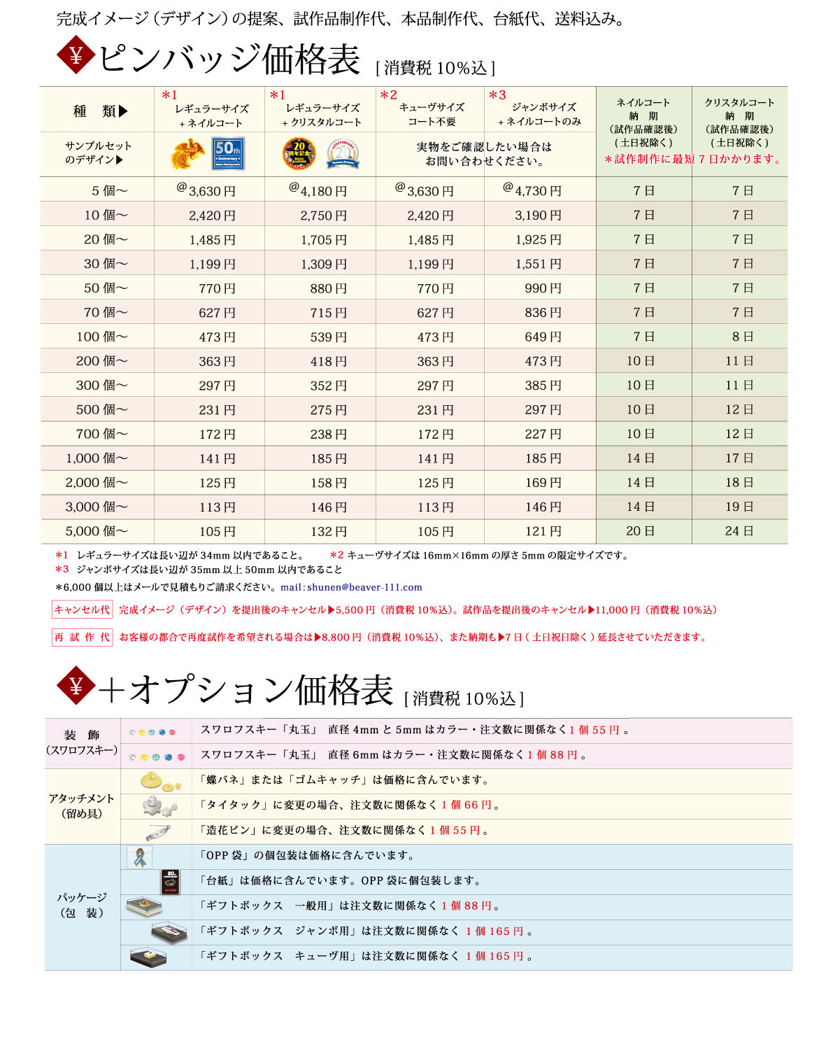 | 数量 | 5個~ | 10個~ | 20個~ | 30個~ | 50個~ | 70個~ | 100個~ | 200個~ | 300個~ | 500個~ | 700個~ | 1000個~ | 2000個~ | 3000個~ | 5000個~ |